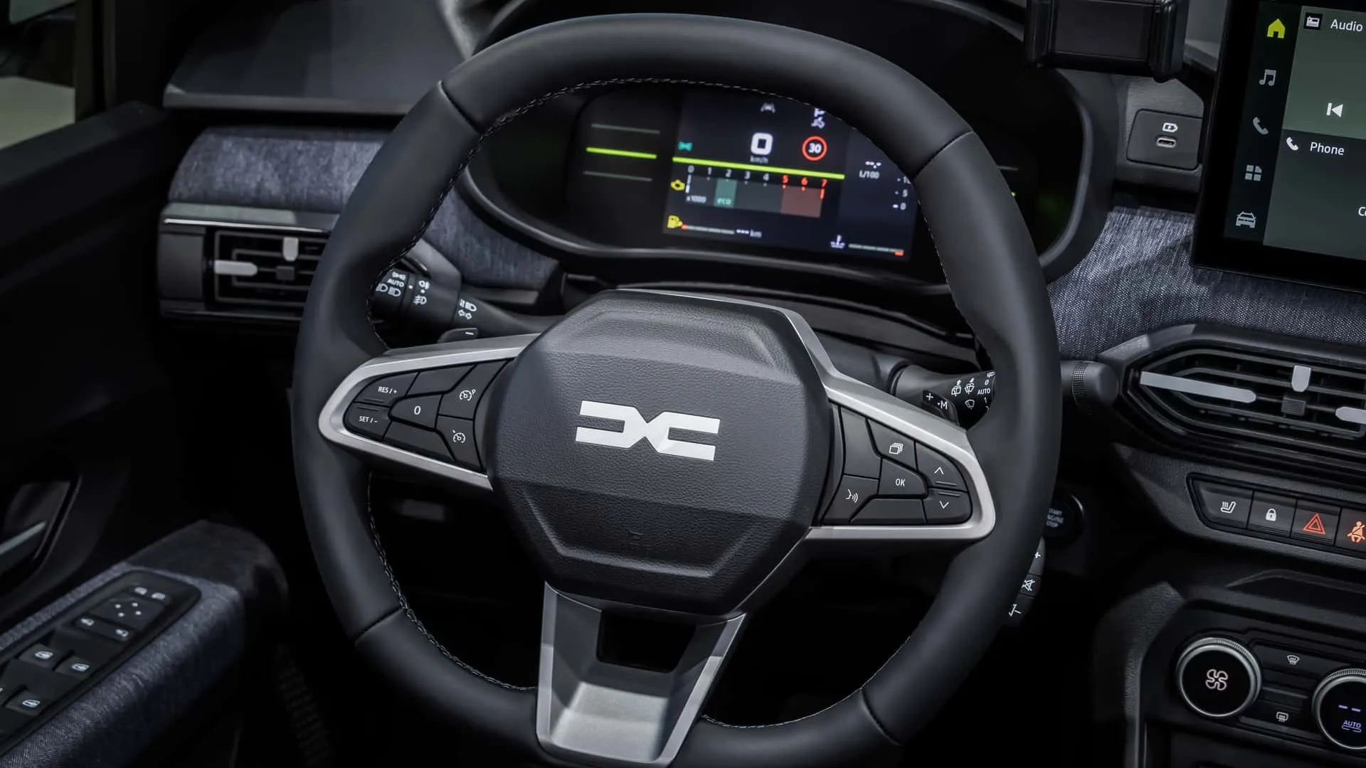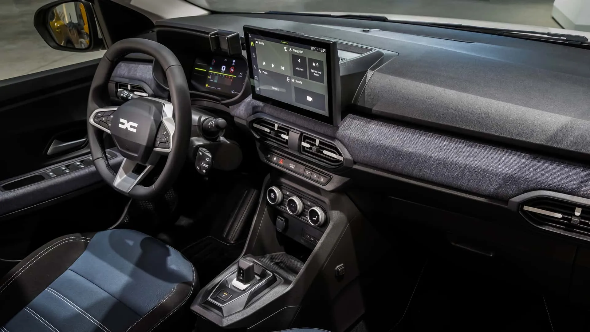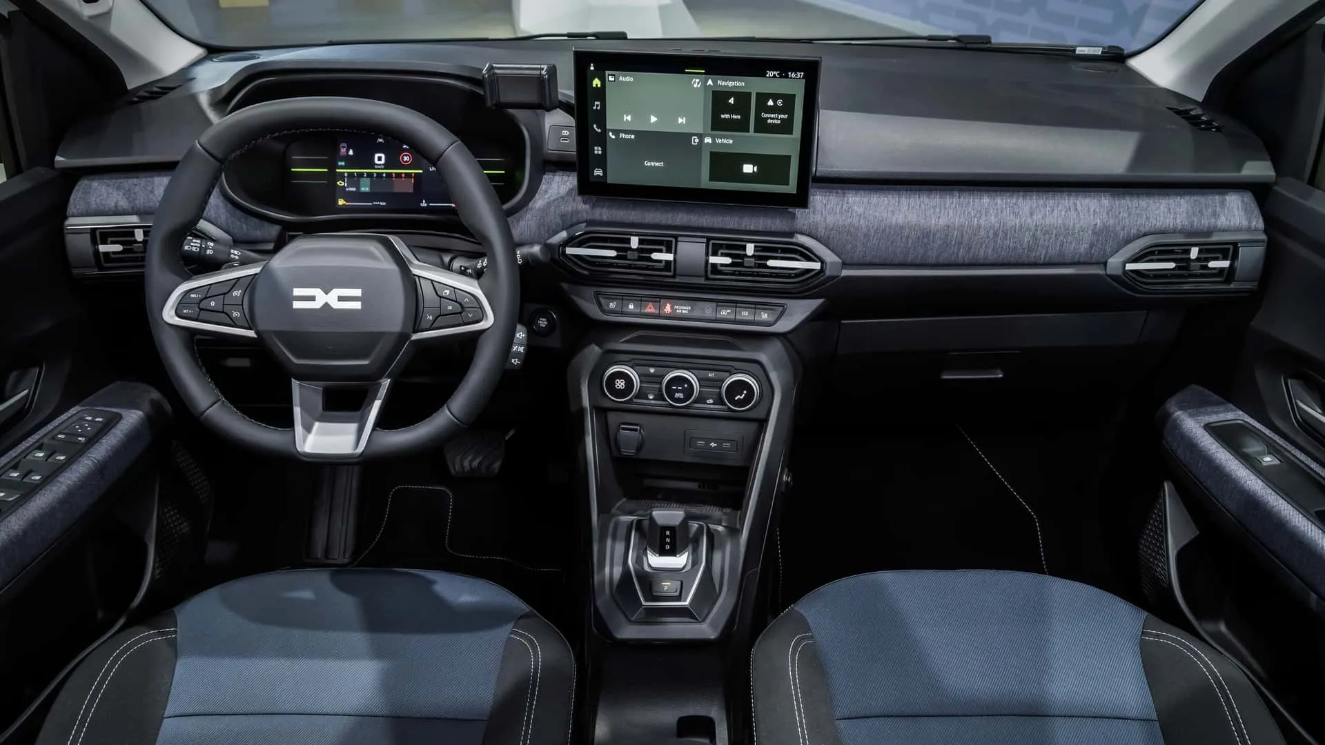 Im Innenraum folgt der Kleinwagen dem Trend des Duster und erhält in einigen Versionen Denim-Stoffbezüge und blaue Akzente, während das Extreme-Modell eine grüne und schwarze Microcloud-Oberfläche aufweist, was beweist, dass Komfort und Widerstandsfähigkeit Hand in Hand gehen können. Ein weiteres Highlight im Innenraum ist das neue digitale 7-Zoll-Display und das Multimedia-Center mit einem zentralen 10,1-Zoll-Bildschirm, das Konnektivität und einfachen Zugriff auf Funktionen mit Navigationsunterstützung und induktivem Laden bietet.