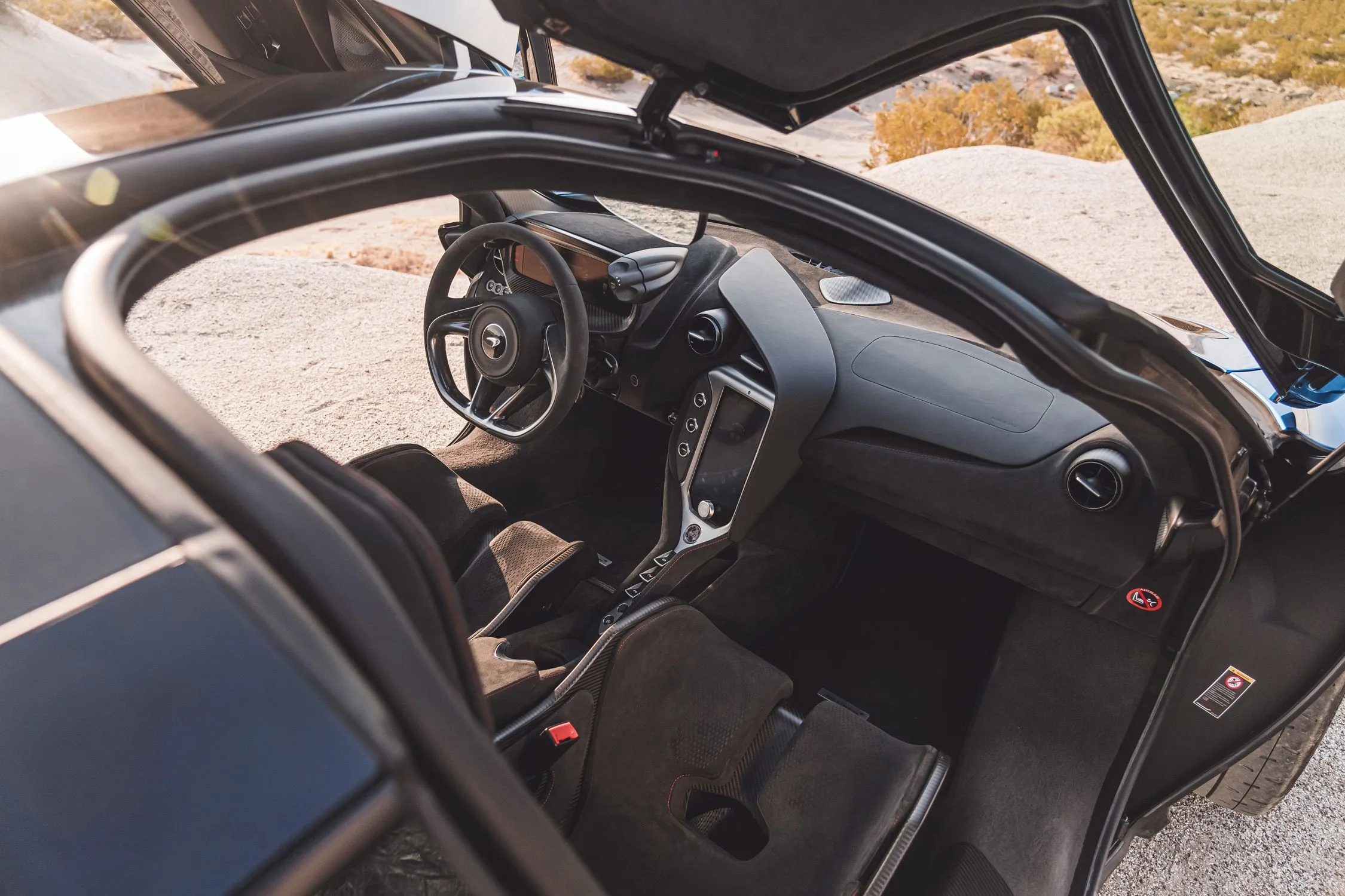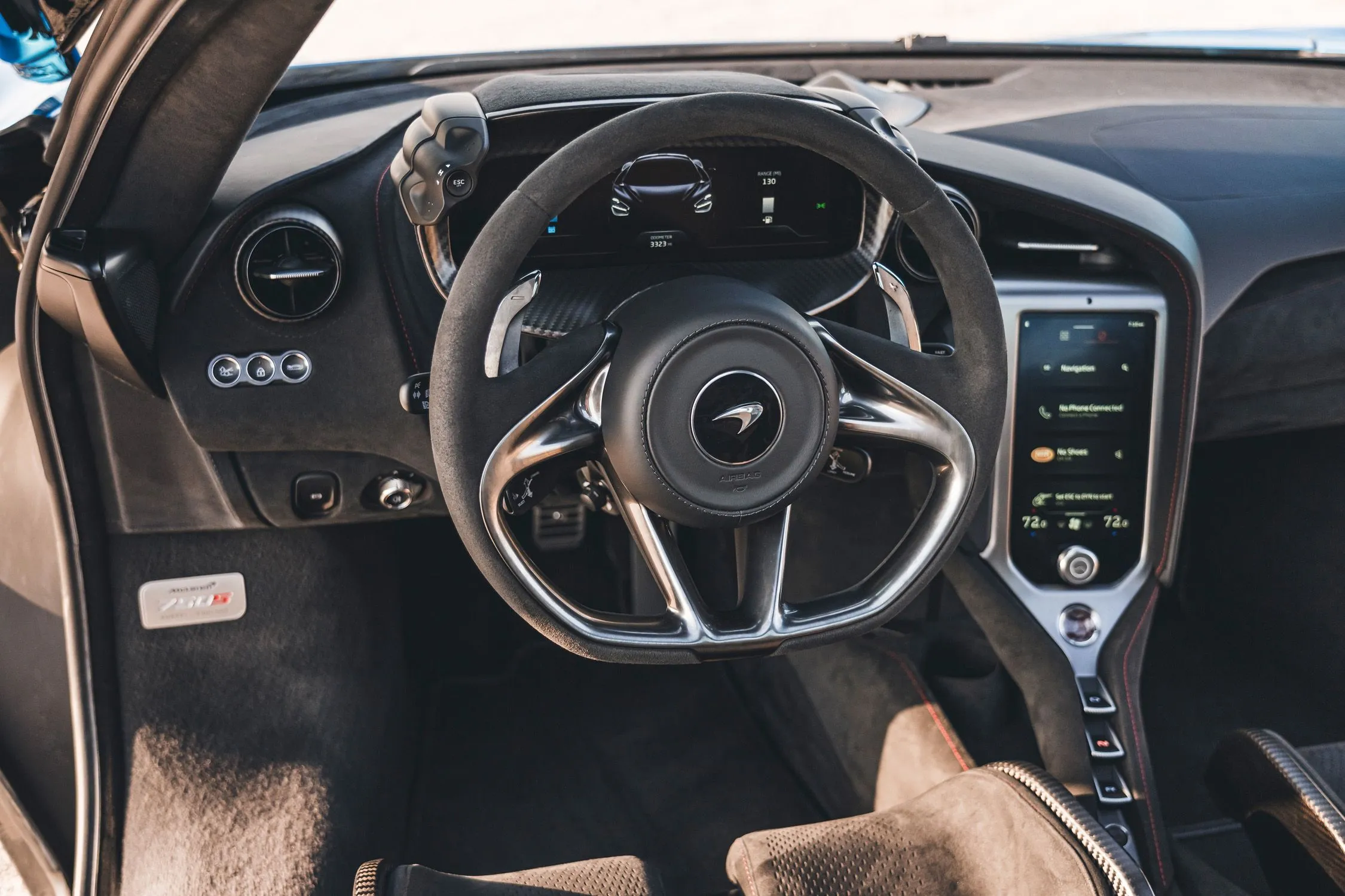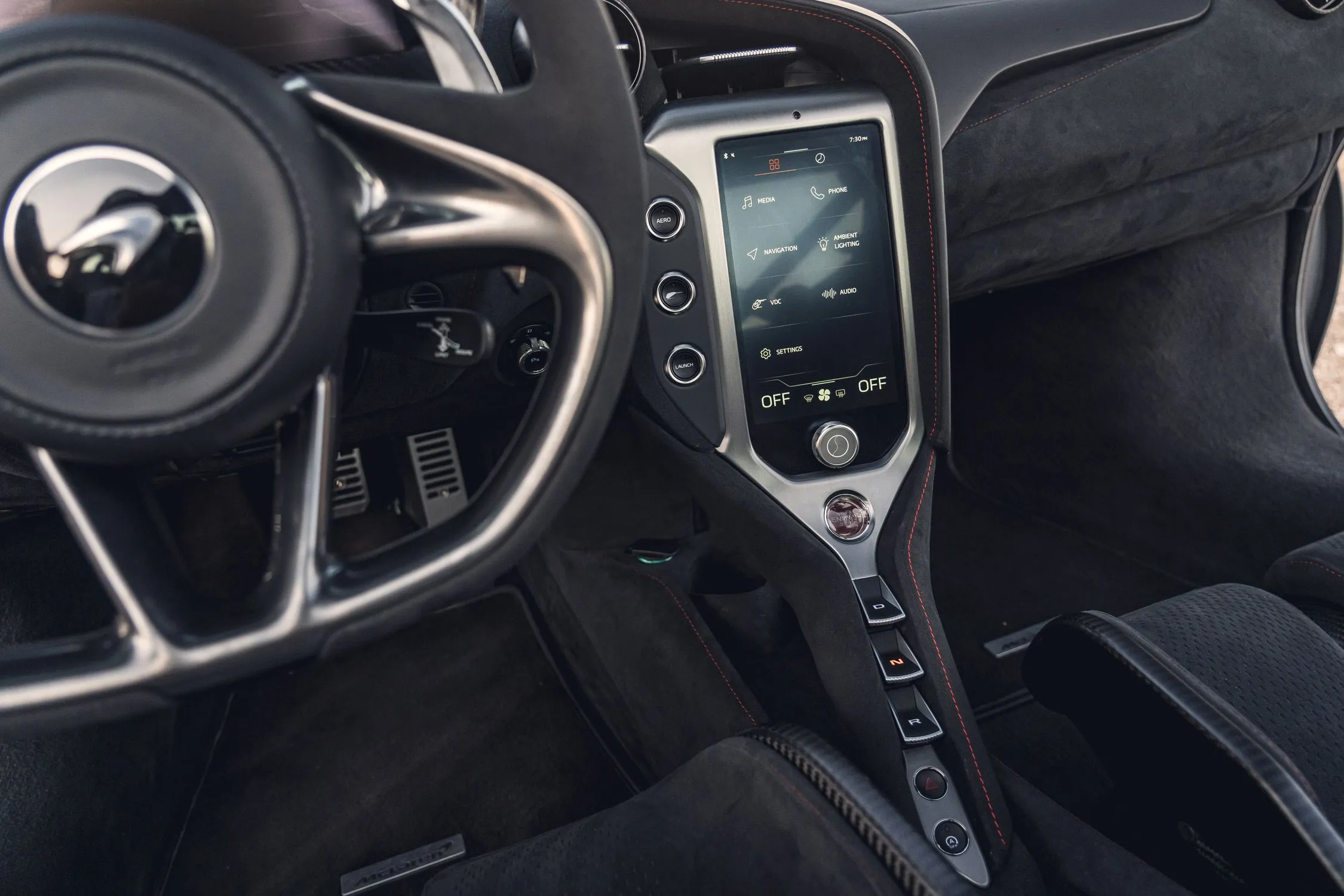 O interior do 750S é propositalmente minimalista: foco no essencial, com materiais premium e personalização por encomenda. Para clientes no Brasil, as opções de acabamento — desde couro até Alcantara — e sistemas de som premium são atrativos clássicos de carros desse nível.